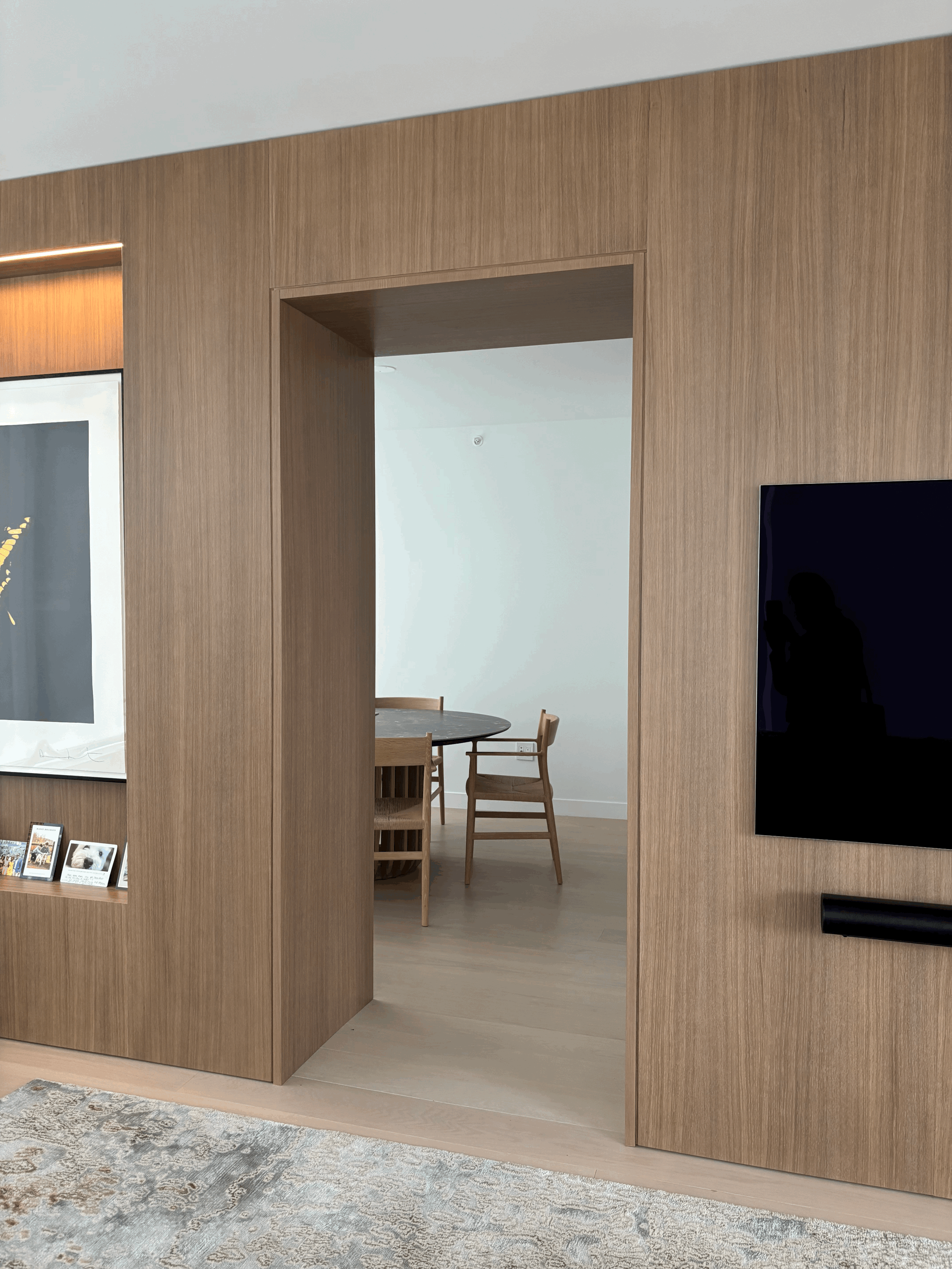 Walnut hardwood with natural edge top, sliding door panels with integrated pulls,